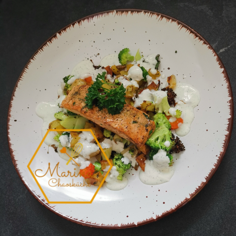 Heute gibt´s ein Lachsfilet auf Ofengemüse von mir.