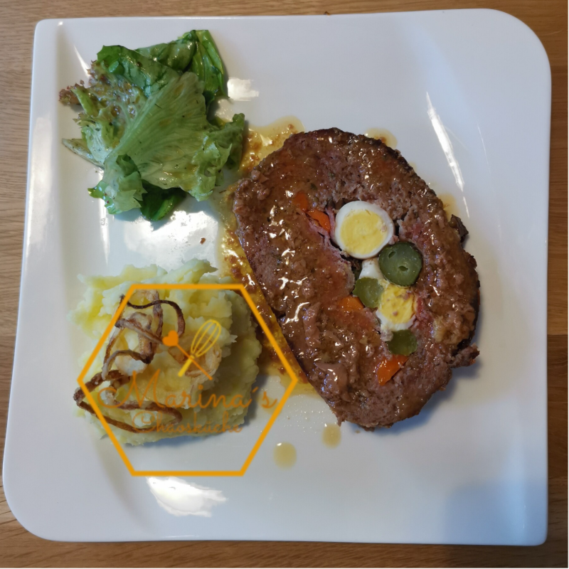 Heute gibt´s einen Faschierten Braten mit Kartoffelpüree und Röstzwiebel von mir. Faschiertes liebe ich in allen Variationen.