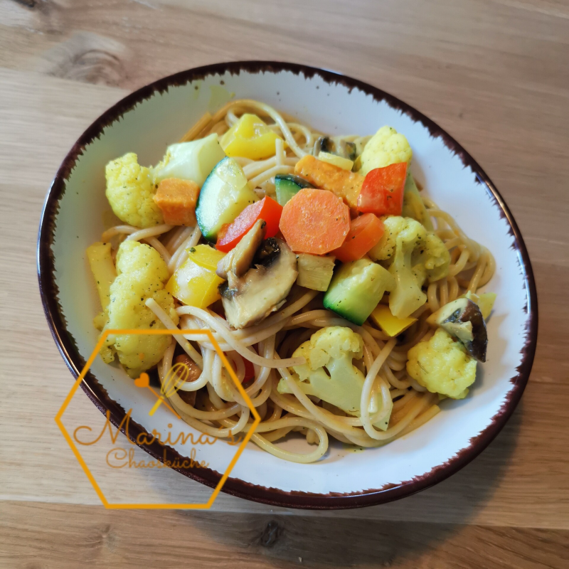 Die Spaghetti kochen. Süßkartoffel schälen und in kleine Würfel schneiden. Zwiebel und Knoblauch schälen und klein schneiden. Süßkartoffel, Zwiebel und Knoblauch in Olivenöl anrösten und mit Wasser und Schlagobers aufgießen. Köcheln lassen bis die Süßkartoffel weich ist. Das restliche Gemüse waschen, schälen und klein schneiden. Alles in die Pfanne hinzufügen und kräftig würzen. Von der Currypaste ca. 1 TL dazugeben je nach gewünschter Schärfe. Die gekochten Nudeln hinzufügen und noch kurz köcheln lassen. Das Gemüse sollte noch knackig sein.