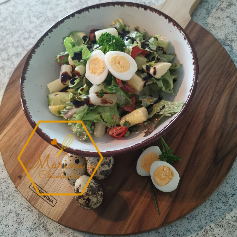 Spargel gut schälen in 2cm große Stücke schneiden und in Wasser mit Zucker und Salz kochen. Das Gemüse waschen und klein würfelig schneiden. Die Salatblätter waschen und klein zupfen. Die Eier schälen und ebenfalls in kleine Würfel schneiden. Den Spargel und die anderen Zutaten in einer Schüssel vermischen. Für das Dressing alle Zutaten in einen Becher geben und gut Verrühren. Mit Schnittlauch und Knoblauch garnieren und Anrichten. Eine Balsamico Reduktion oben drauf ist das "i-Tüpfelchen".